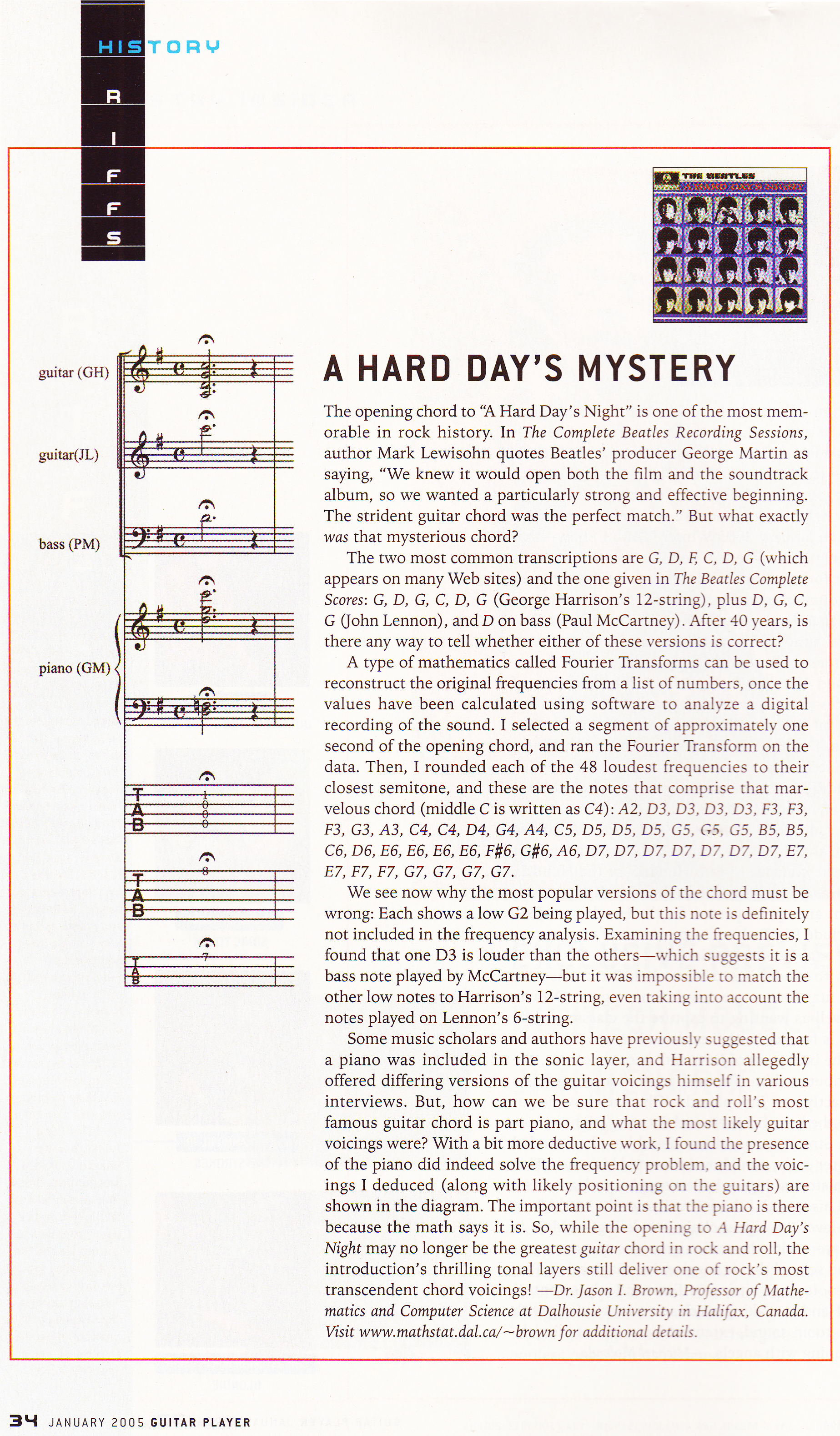That famous opening chord - is there any other chord in rock 'n' roll that is as instantly recognizable? Yet, how George Harrison got that sound out of his Rickenbacker 12-string was an enduring mystery. It took a bit of mathematics to uncover the rest of the story. The original article Mathematics, Physics and A Hard Day's Night appeared in the October 2004 issue of the CMS (Canadian Mathematical Society) Notes. The article provides the first scientific evidence for the intrumentation, notes and voicing of the famous chord that opened The Beatles' movie of the same name. It wasn't just George Harrison playing on that chord, nor was he the only George contributing!