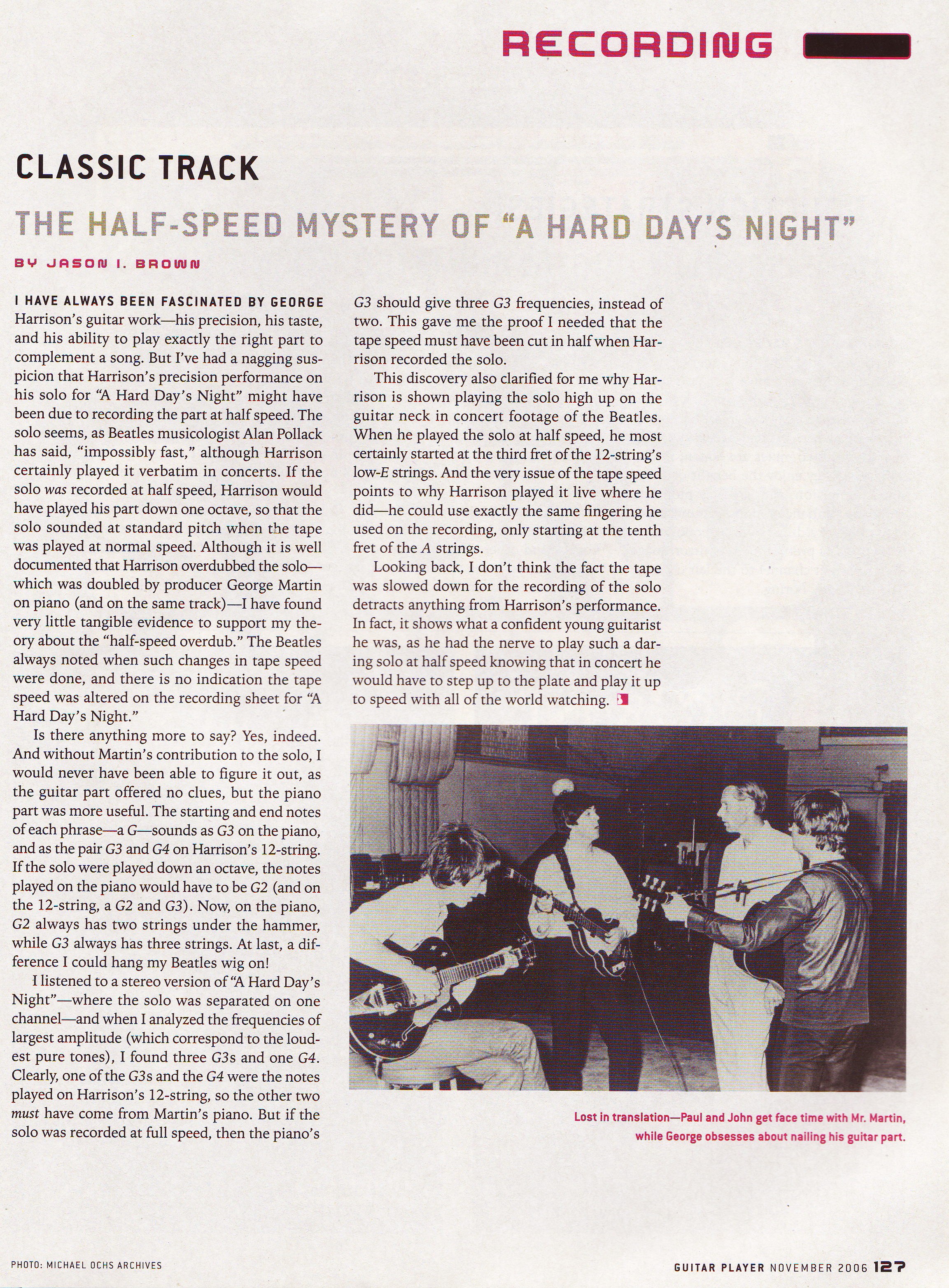 George Harrison's solo in A HardDay's Night is a feat of mastery, not only in its construction, but also in its technicality. How did George play it so fast and so accurately? The Half-Speed Mystery of "A Hard Day's Night" provides proof that the Georges (!) recorded the solo at half-speed down the octave and appeared in the November 2006 issue of Guitar Player Magazine.