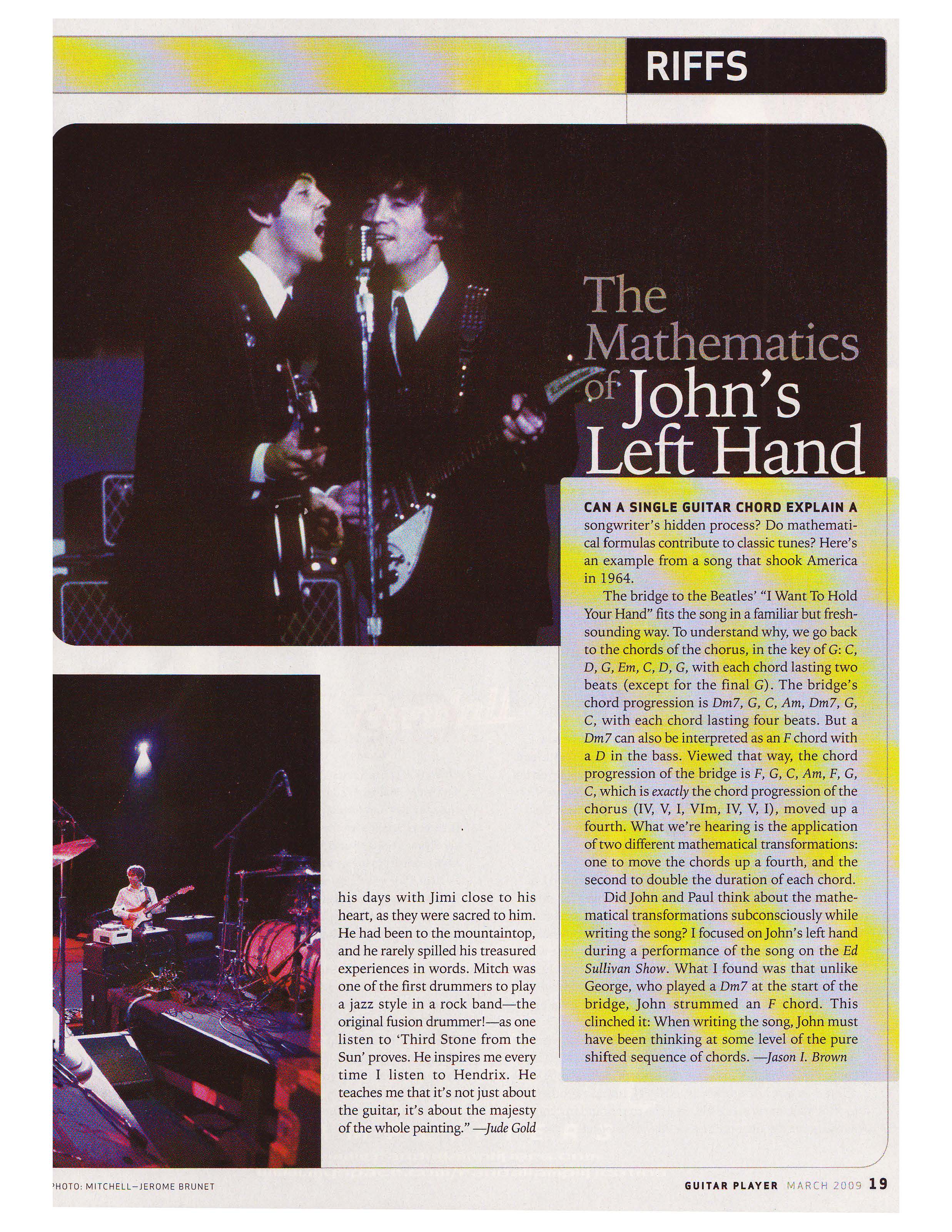 The Beatles conquered America with I Want To Hold Your Hand, an amazing song. have you ever noticed that the melody is completely in key, with nary a blues note to be found? And yet the song rocks. In an article in Guitar Player Magazine (March 2009) I describe the mathematics that John and Paul used, subconsciously, when writing the bridge of the song. The very proof lies in John's left hand!